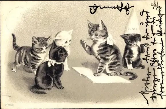 Litho Vermenschlichte Katzen, Buch, Papierhut