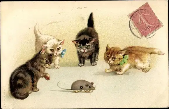 Litho Vier junge Katzen beobachten eine Aufziehmaus