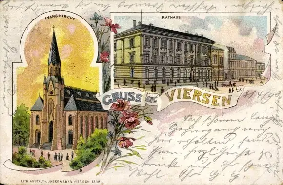 Litho Viersen in Nordrhein Westfalen, Evang. Kirche, Rathaus