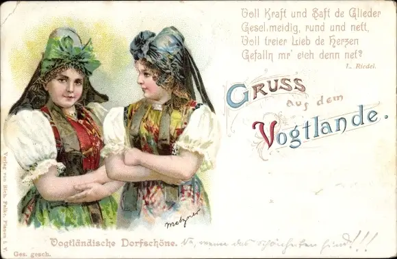 Litho Vogtländische Dorfschöne, Frauen in Volkstrachten
