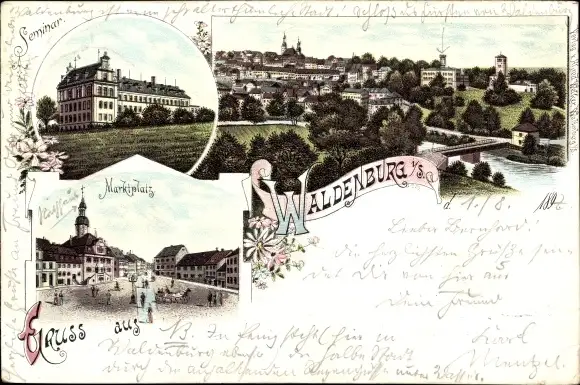 Litho Waldenburg in Sachsen, Seminar, Marktplatz, Blick auf den Ort