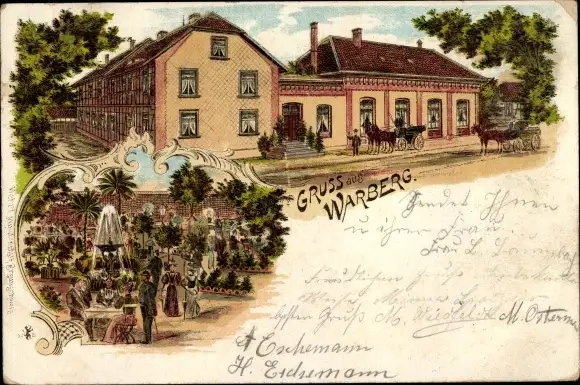 Litho Warberg in Niedersachsen, Partie an einem Gasthaus, Kutschen