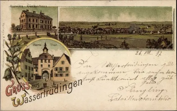 Litho Wassertrüdingen in Mittelfranken, Oberes Tor, Krankenhaus, Blick auf den Ort