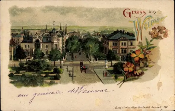 Litho Weimar in Thüringen, Stadtansicht, Blumen, Passanten