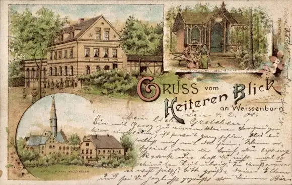 Litho Weißenborn Zwickau in Sachsen, Gasthaus Zum Heiteren Blick, Kirche