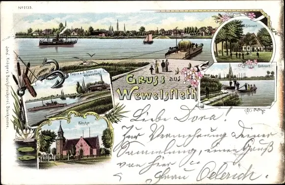 Litho Wewelsfleth in Schleswig Holstein, Kirche, Fähre, Blick auf den Ort