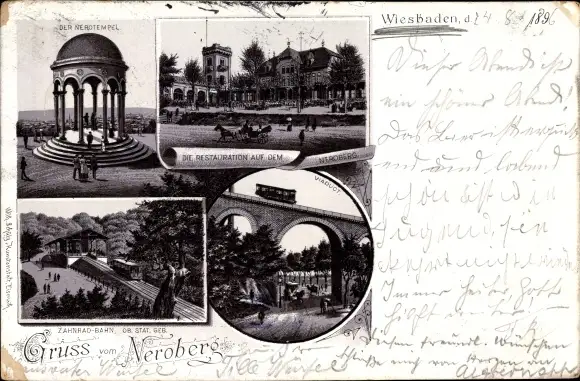 Litho Wiesbaden in Hessen, Neroberg, Nerotempel, Restaurant, Zahnradbahn, Viadukt