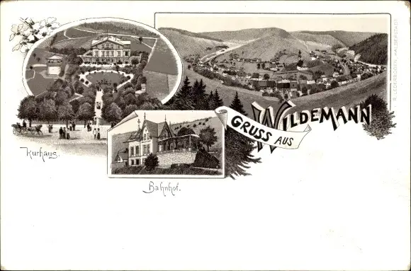 Litho Wildemann Clausthal Zellerfeld im Oberharz, Kurhaus, Bahnhof, Totalansicht