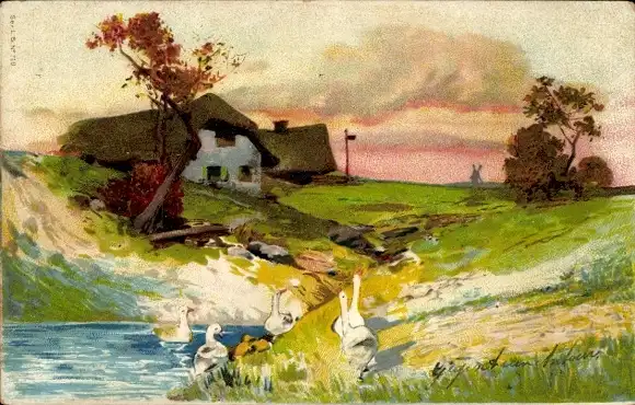 Litho Wohnhaus, Wiese, Gänse, Teich