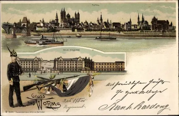 Litho Worms am Rhein, Neue Kaserne, Totalansicht, Soldat, Fahne