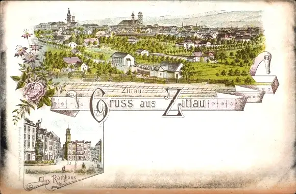 Litho Zittau in Sachsen, Gesamtansicht, Rathaus