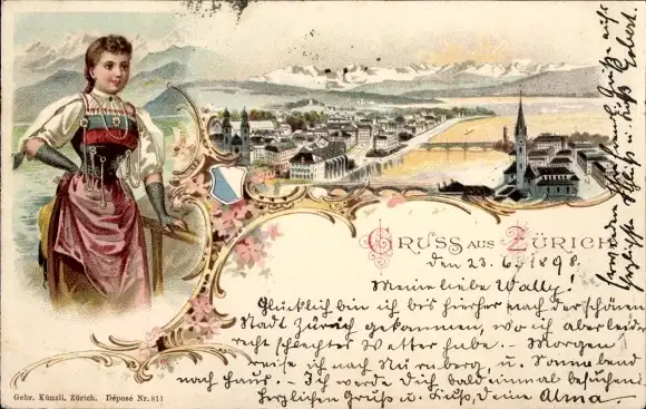 Litho Zürich Stadt Schweiz, Frau in Tracht, Teilansicht der Stadt
