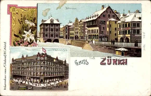 Litho Zürich Stadt Schweiz, Warenhaus, Rathausquai