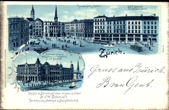 Litho Zürich Stadt Schweiz, Zürcher Schirmfabrik, Paradeplatz