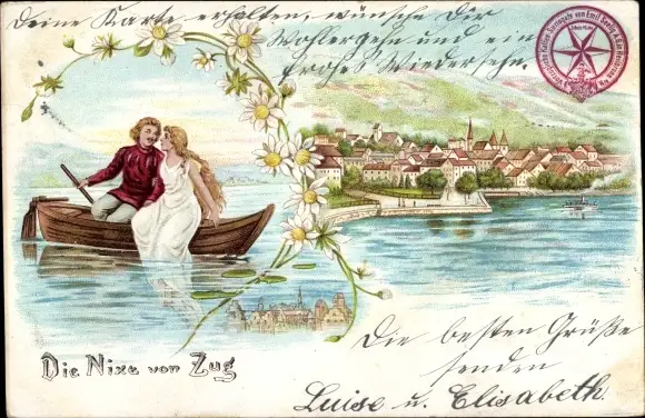 Litho Zug Stadt Schweiz, Die Nixe von Zug, Mann im Boot