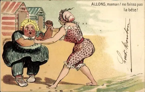 Litho Zwei Frauen streiten sich am Strand, Bademode, Badeanzug