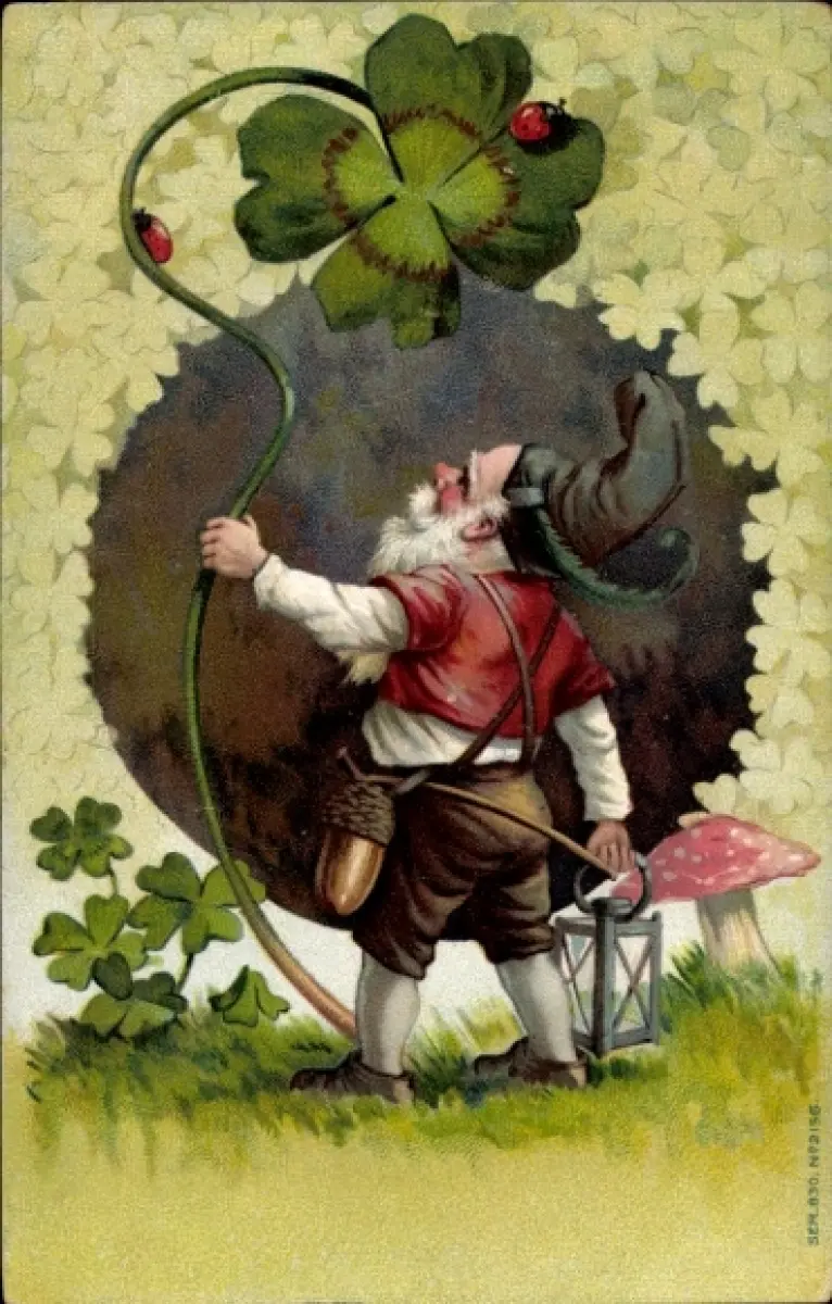 Litho Zwerg mit Kleeblatt, Fliegenpilz, Marienkäfer