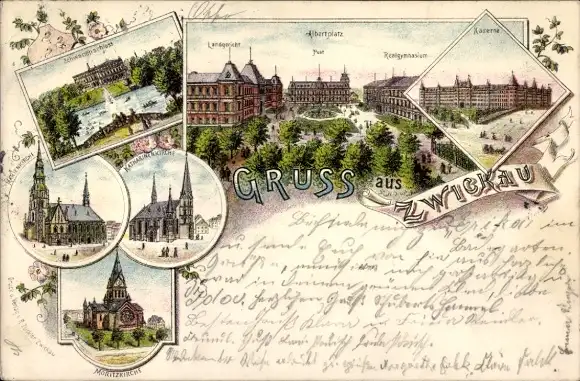 Litho Zwickau in Sachsen, Albertplatz, Kaserne, Schwanenschloss, Marienkirche, Moritzkirche