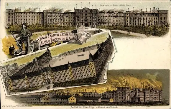 Litho Zwickau in Sachsen, Brand der Kaserne d. K. S. 9. Inf. Reg. No. 133
