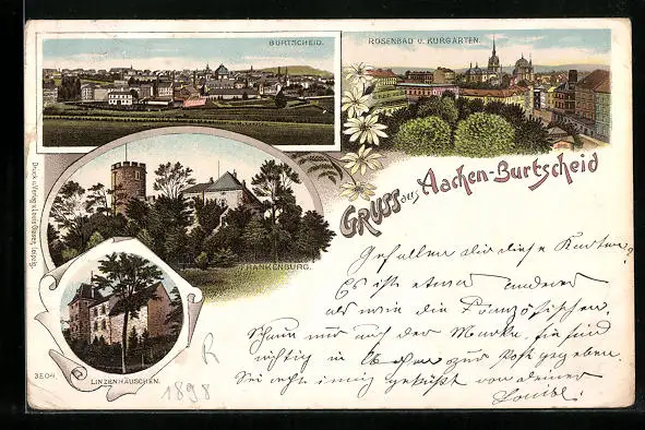 Lithographie Aachen-Burtscheid, Rosenbad u. Kurgarten, Frankenburg
