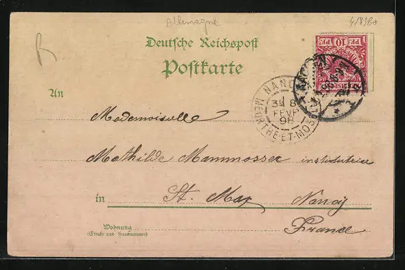 Personenbezogene Daten auf der Rückseite der Karte wurden durch blauen Textmarker unkenntlich gemacht. Die blauen Stellen sind auf die Vorderseite durchgeweicht und wirken sich negativ auf das Postkartenfoto aus