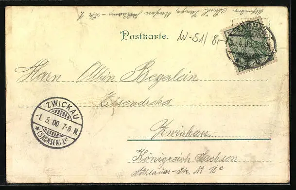 gelaufen 1900, Bugspur mittig u. li. mittig, Einrisse re. oben u. re. unten, guter Zustand