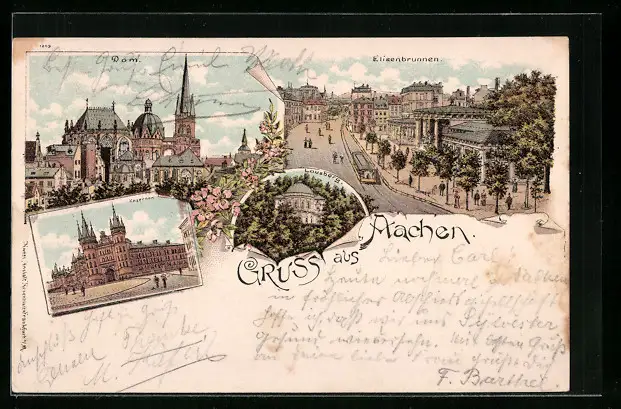 Lithographie Aachen, Elisenbrunnen, Dom, Kasernen, Strassenbahn