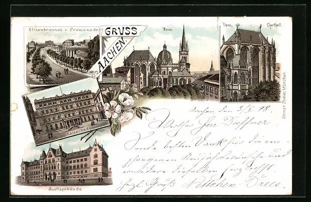 Lithographie Aachen, Elisenbrunnen, Dom und Justizgebäude