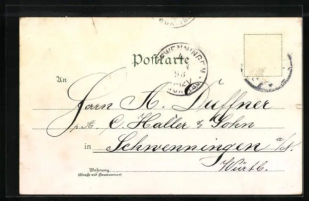 Personenbezogene Daten auf der Rückseite der Karte wurden durch blauen Textmarker unkenntlich gemacht. Die blauen Stellen sind auf die Vorderseite durchgeweicht und wirken sich negativ auf das Postkartenfoto aus