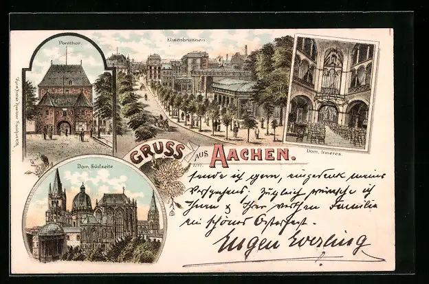Lithographie Aachen, Elisenbrunnen, Pontthor, Dom
