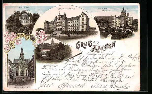 Lithographie Aachen, Justizgebäude, Mariahilf Hospital, Belvedere