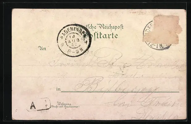 Personenbezogene Daten auf der Rückseite der Karte wurden durch blauen Textmarker unkenntlich gemacht. Die blauen Stellen sind auf die Vorderseite durchgeweicht und wirken sich negativ auf das Postkartenfoto aus
