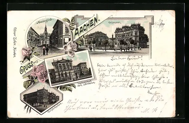 Lithographie Aachen, Kaiserplatz, Polytechnikum, Marienkirche