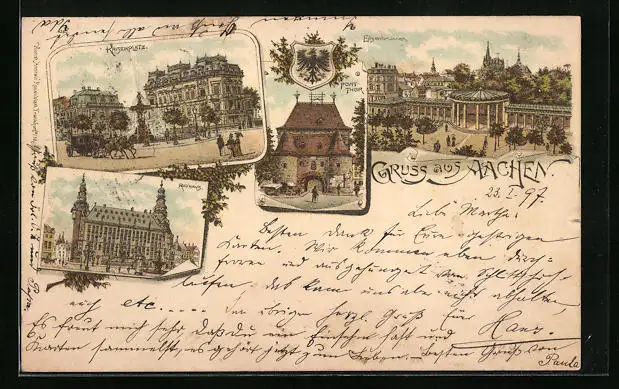 Lithographie Aachen, Kaiserplatz, Rathaus