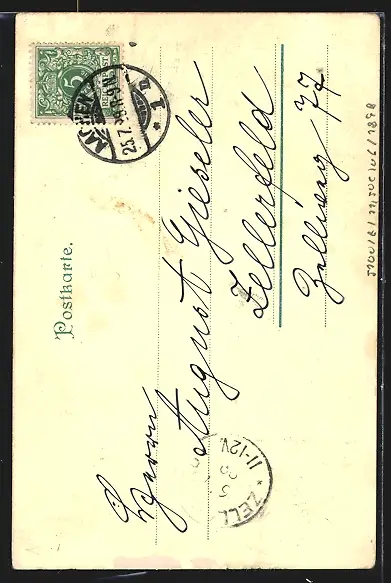Personenbezogene Daten auf der Rückseite der Karte wurden durch blauen Textmarker unkenntlich gemacht. Die blauen Stellen sind auf die Vorderseite durchgeweicht und wirken sich negativ auf das Postkartenfoto aus