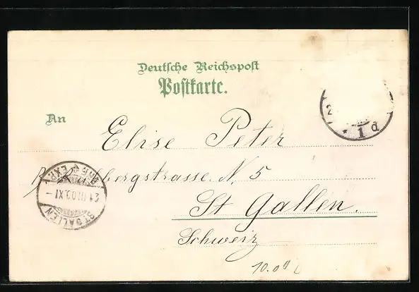 Personenbezogene Daten auf der Rückseite der Karte wurden durch blauen Textmarker unkenntlich gemacht. Die blauen Stellen sind auf die Vorderseite durchgeweicht und wirken sich negativ auf das Postkartenfoto aus