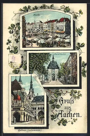 Lithographie Aachen, Markt, Marschiertor, Rathaus
