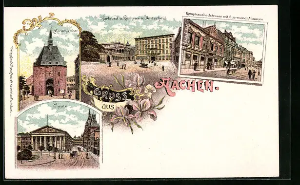 Lithographie Aachen, Marschierthor, Theater, Komphausbadstrasse