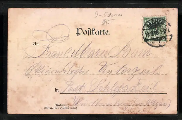 Personenbezogene Daten auf der Rückseite der Karte wurden durch blauen Textmarker unkenntlich gemacht. Die blauen Stellen sind auf die Vorderseite durchgeweicht und wirken sich negativ auf das Postkartenfoto aus