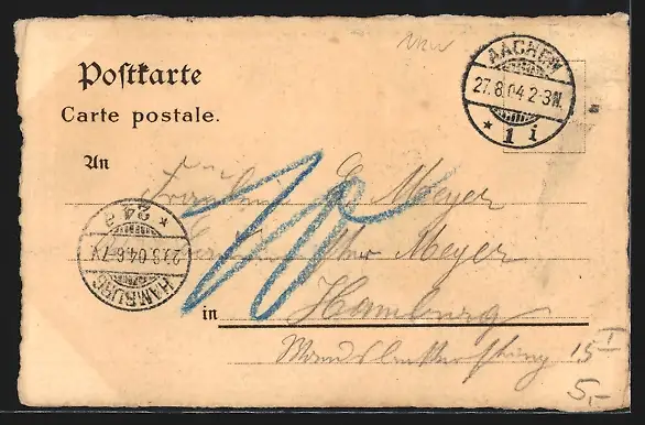 Personenbezogene Daten auf der Rückseite der Karte wurden durch blauen Textmarker unkenntlich gemacht. Die blauen Stellen sind auf die Vorderseite durchgeweicht und wirken sich negativ auf das Postkartenfoto aus