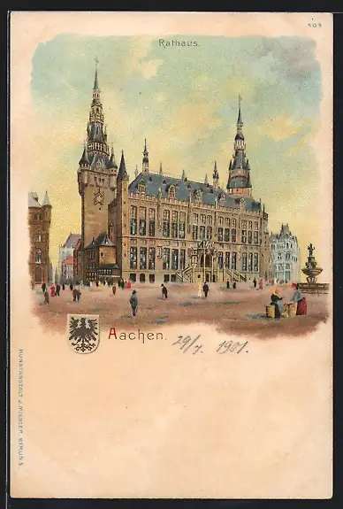 Lithographie Aachen, das Rathaus, Stadtwappen