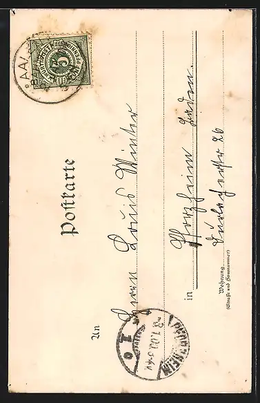 Personenbezogene Daten auf der Rückseite der Karte wurden durch blauen Textmarker unkenntlich gemacht. Die blauen Stellen sind auf die Vorderseite durchgeweicht und wirken sich negativ auf das Postkartenfoto aus