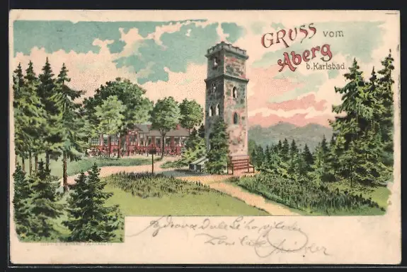 Lithographie Aberg /Karlsbad, Blick auf Turm