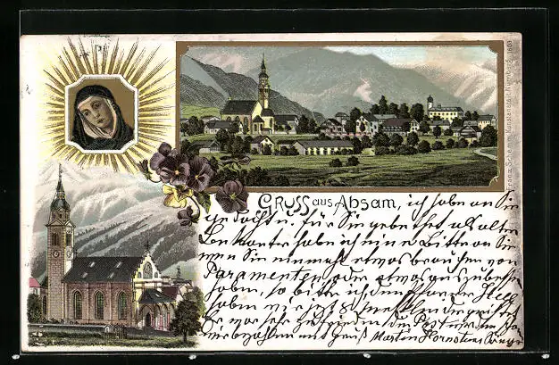 Lithographie Absam, Teilansicht, Kirche, Gnadenbild