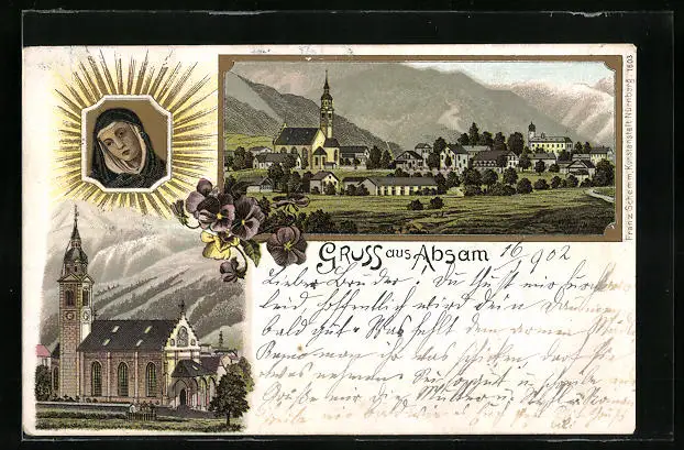 Lithographie Absam, Teilansicht mit Kirche, Mariendarstellung