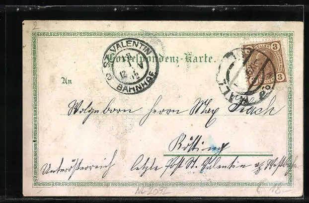 Personenbezogene Daten auf der Rückseite der Karte wurden durch blauen Textmarker unkenntlich gemacht. Die blauen Stellen sind auf die Vorderseite durchgeweicht und wirken sich negativ auf das Postkartenfoto aus