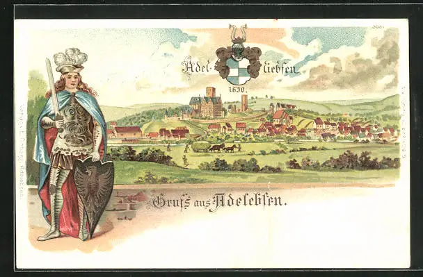 Lithographie Adelebsen, Ortsansicht anno 1650, Wappen