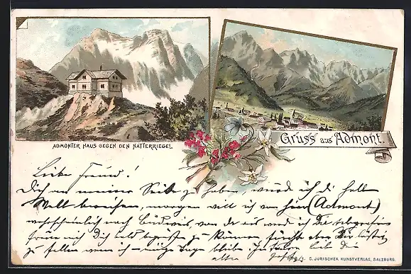 Lithographie Admont, Admonter Haus gegen den Natterriegel und Ortsansicht