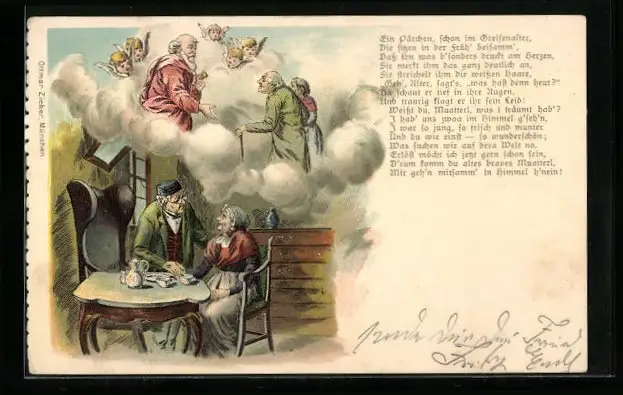 Lithographie Älteres Paar am Tisch und Bei Petrus mit Englein