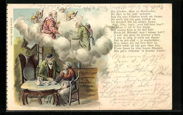 Lithographie Älteres Paar am Tisch und Bei Petrus mit Englein